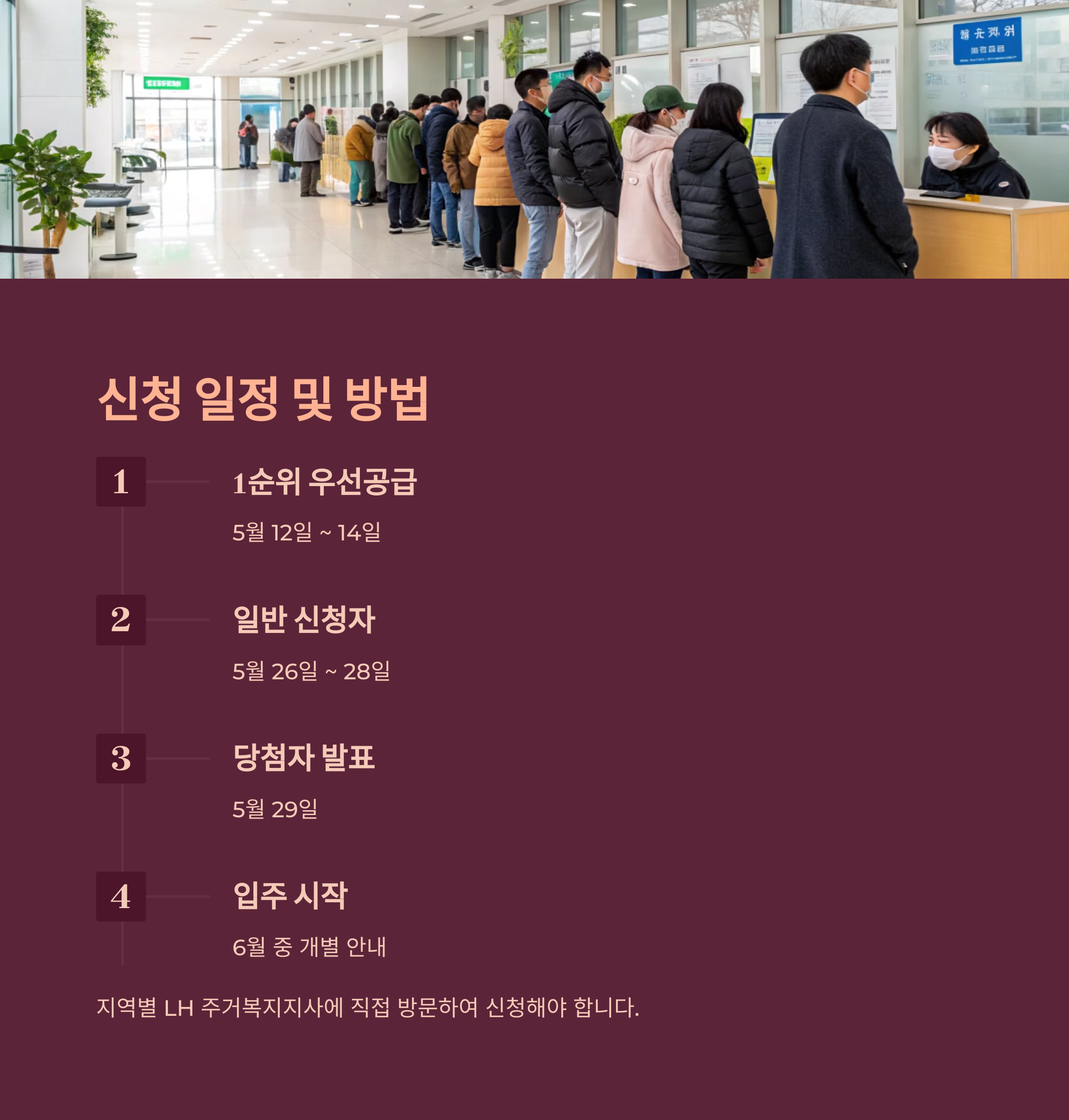신청 일정은 두 차례로 나뉘어 진행되며, 지역별 LH 주거복지지사에 직접 방문 신청해야 합니다.